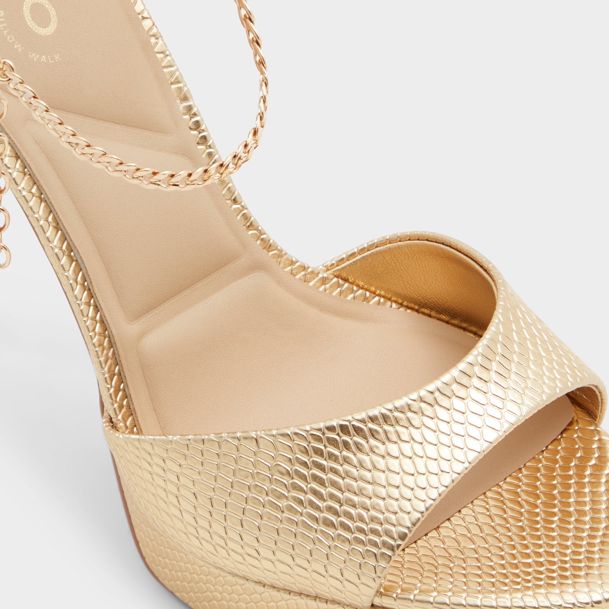 Molten-gold snakeskin and a glimmering ankle chain set the stage, while a sky-high stiletto balanced by a hidden platform lets you float through entrances with surprising comfort and that can’t-miss, camera-flash confidence. Pair with a minimal slip dress for rooftop receptions, or swap in tailored jumpsuits when cocktail hours stretch toward sunrise.