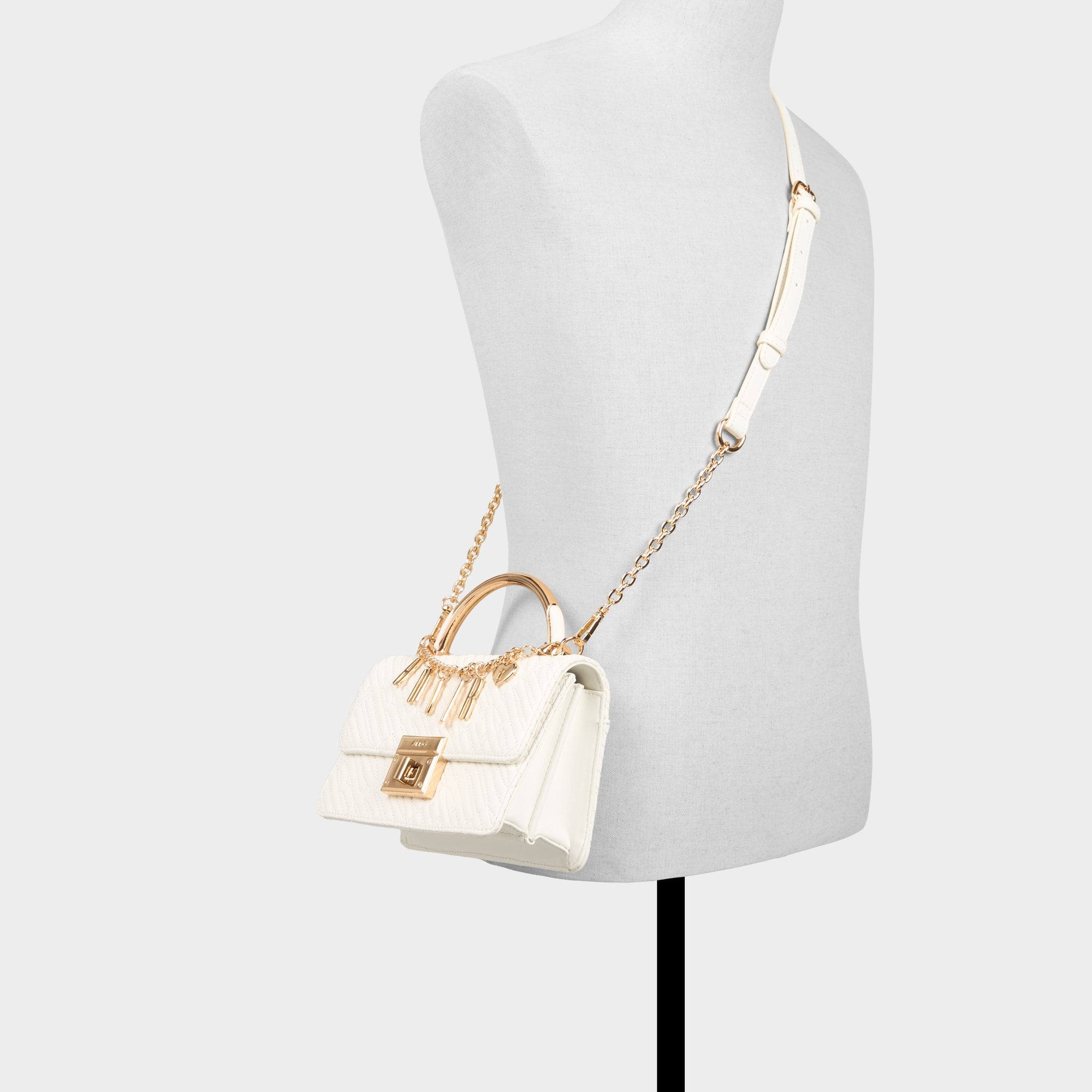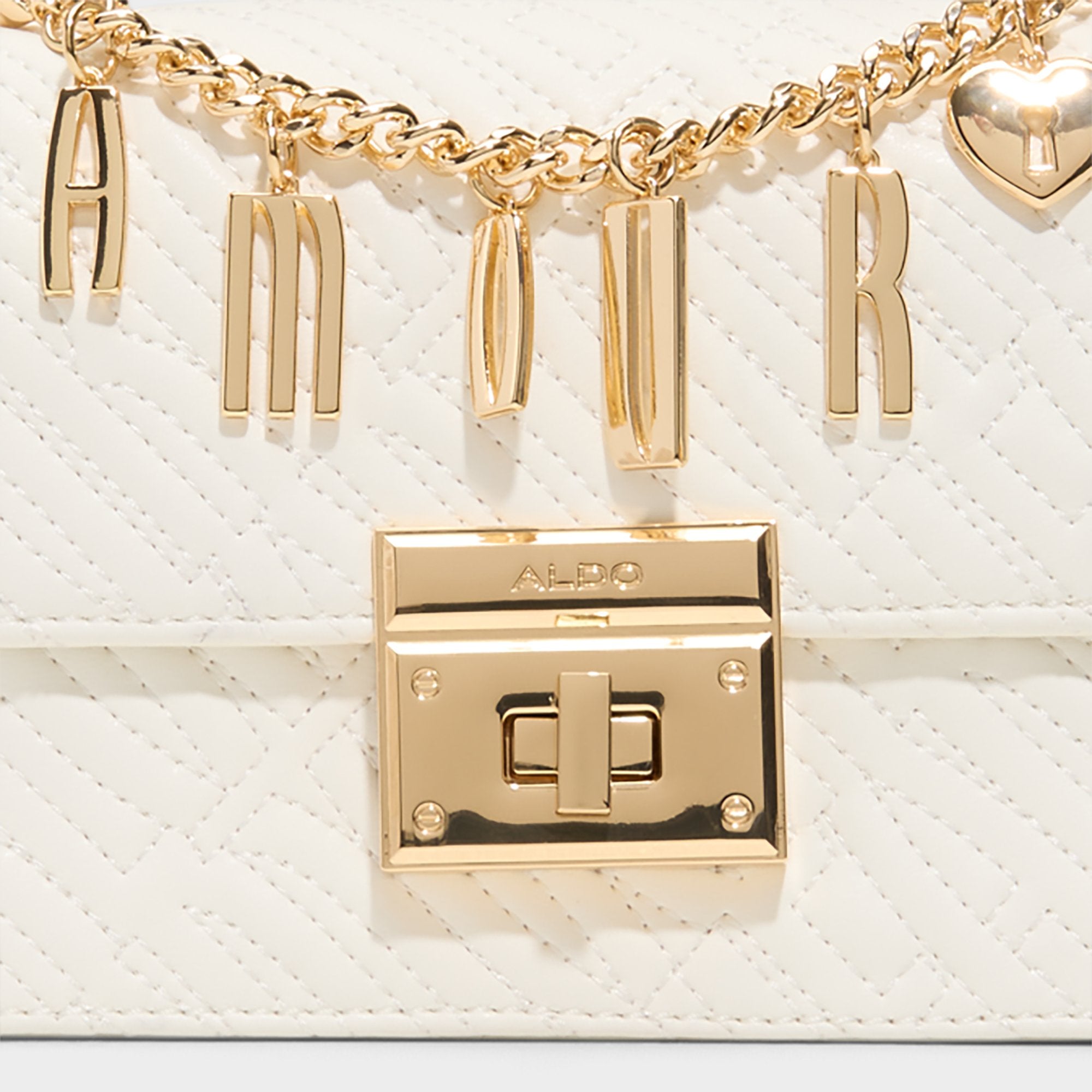 Mini but mighty, this quilted white body pairs with a sleek gold arc handle and a lettered AMOUR chain that adds jewelry vibes while guarding essentials, turning everyday moments into a touch of purse-sized luxe. Carry it with a slip dress for soirees or tuck it under a blazer for brunch dates to finish the look.