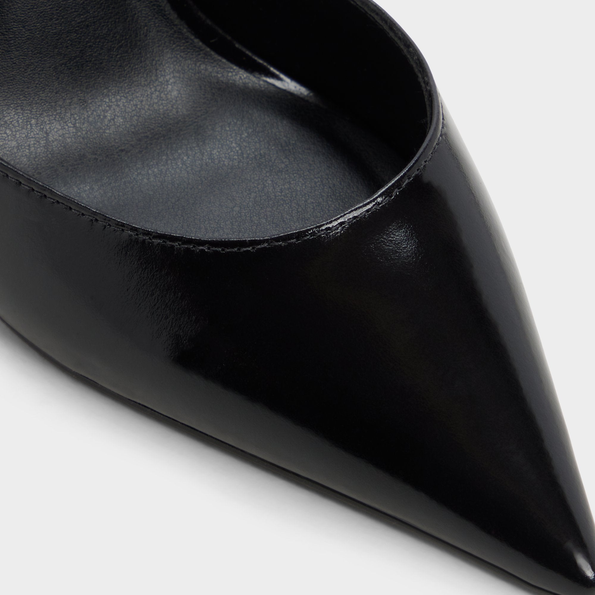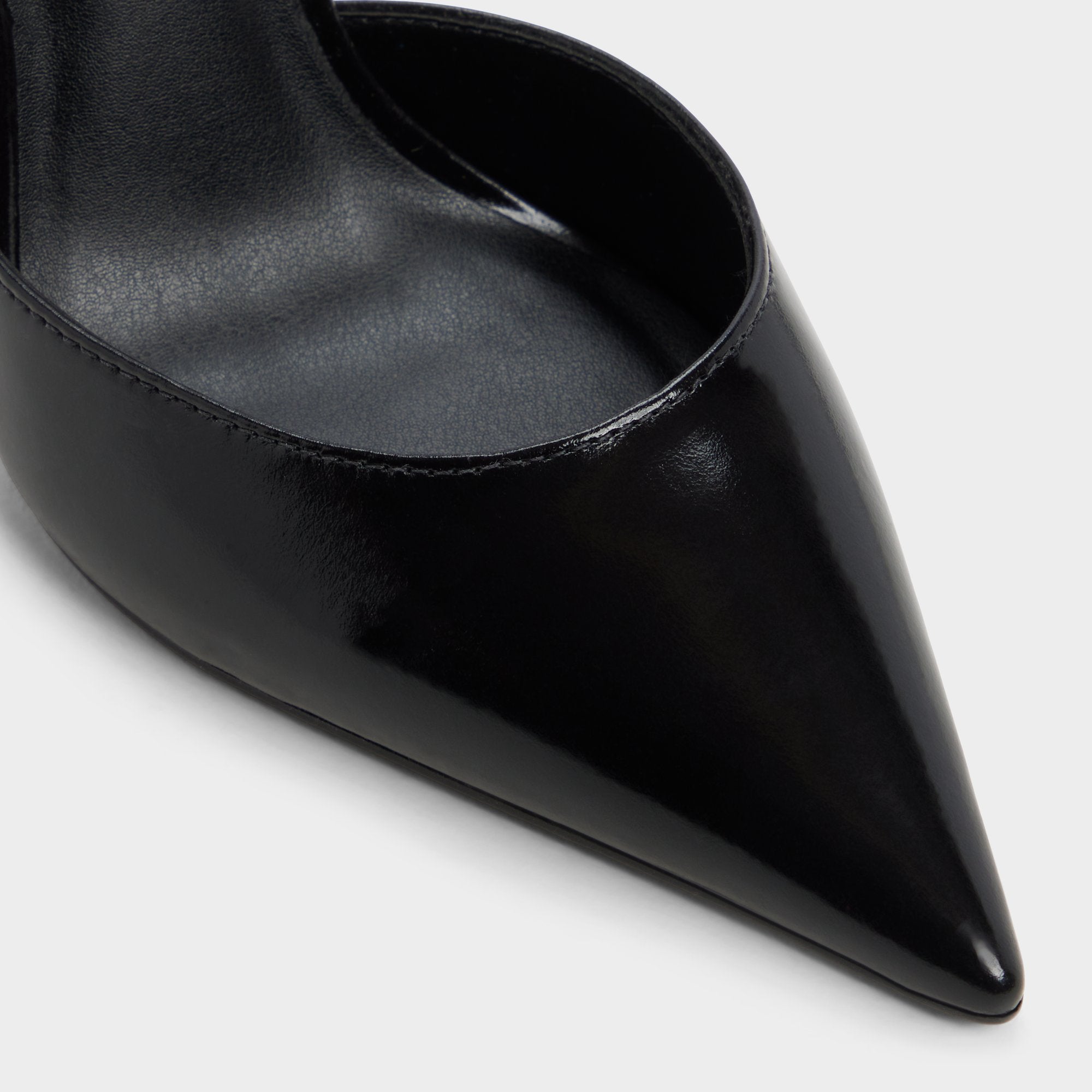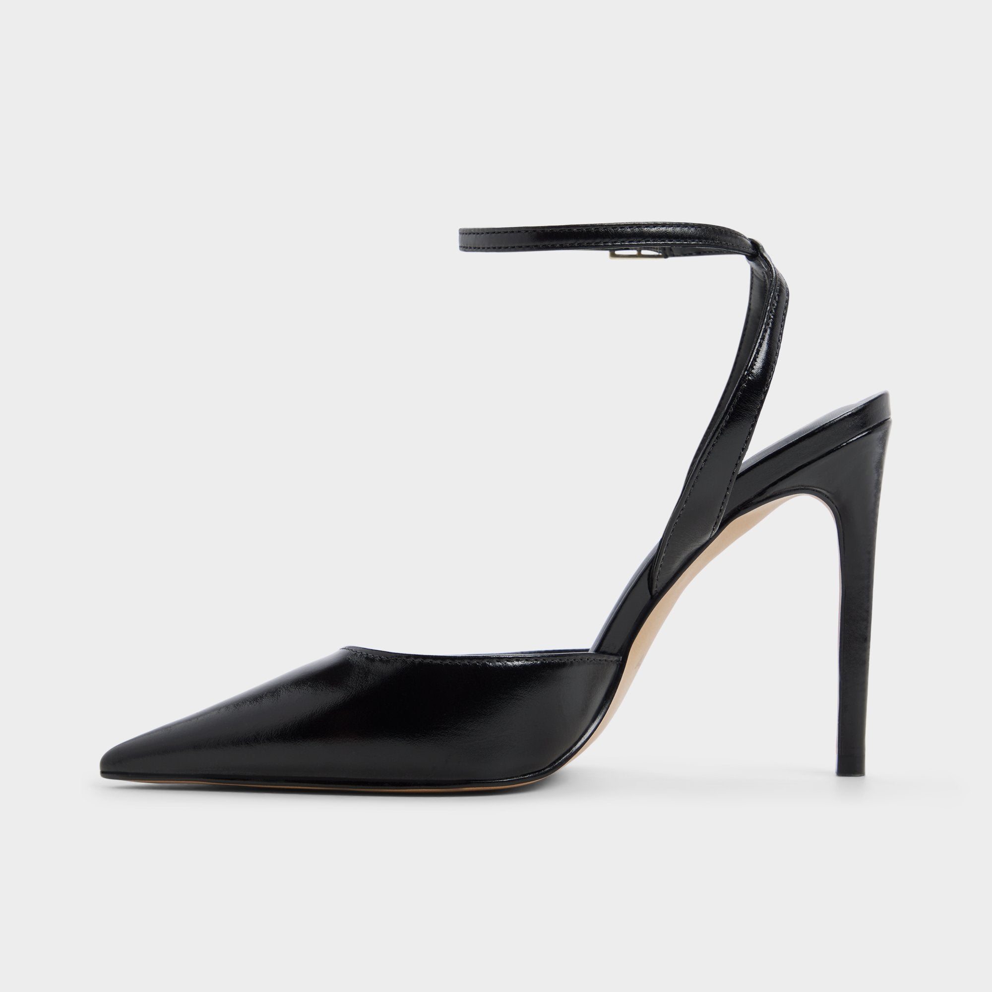 Sharper than a fresh idea, the glossy black leather pump frames every step with a sky-grazing stiletto heel, its delicate gold-buckle ankle strap locking in that after-dark confidence before you even speak. Team it with power suiting for pitch meetings or swap in a satin slip when candlelit dinners slide into rooftop dancing.