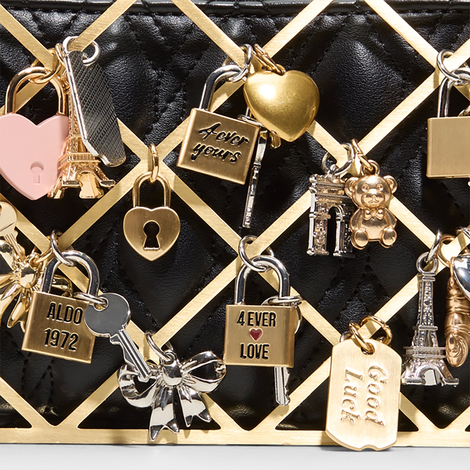 Charm-studded lattice crowns quilted leather, while a gold cage of tiny locks and keys glints along a chunky chain strap, turning this shoulder bag into wearable jewelry. Carry it with a slip dress for rooftop dates, or sling it over sharp tailoring at gallery openings to finish every outfit with a touch of fearless sparkle.