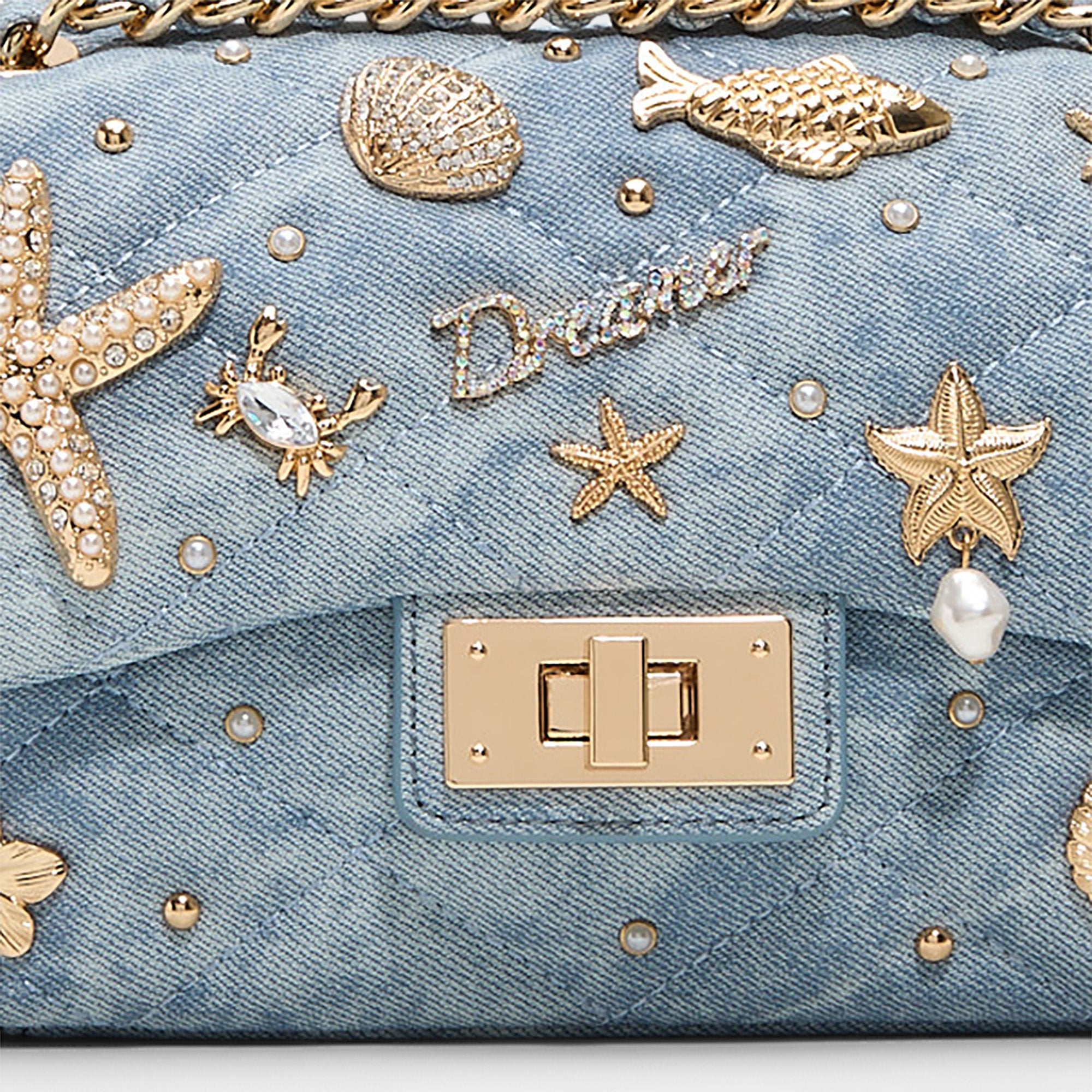 Scattered with glimmering starfish, shells and pearl-touched charms, this ocean-dream shoulder bag teams sun-washed recycled denim with a gleaming turn-lock and chain strap, bringing instant vacation energy to the everyday. Carry it with a slip dress for rooftop drinks or sling it over cargo shorts at weekend markets to polish the look.