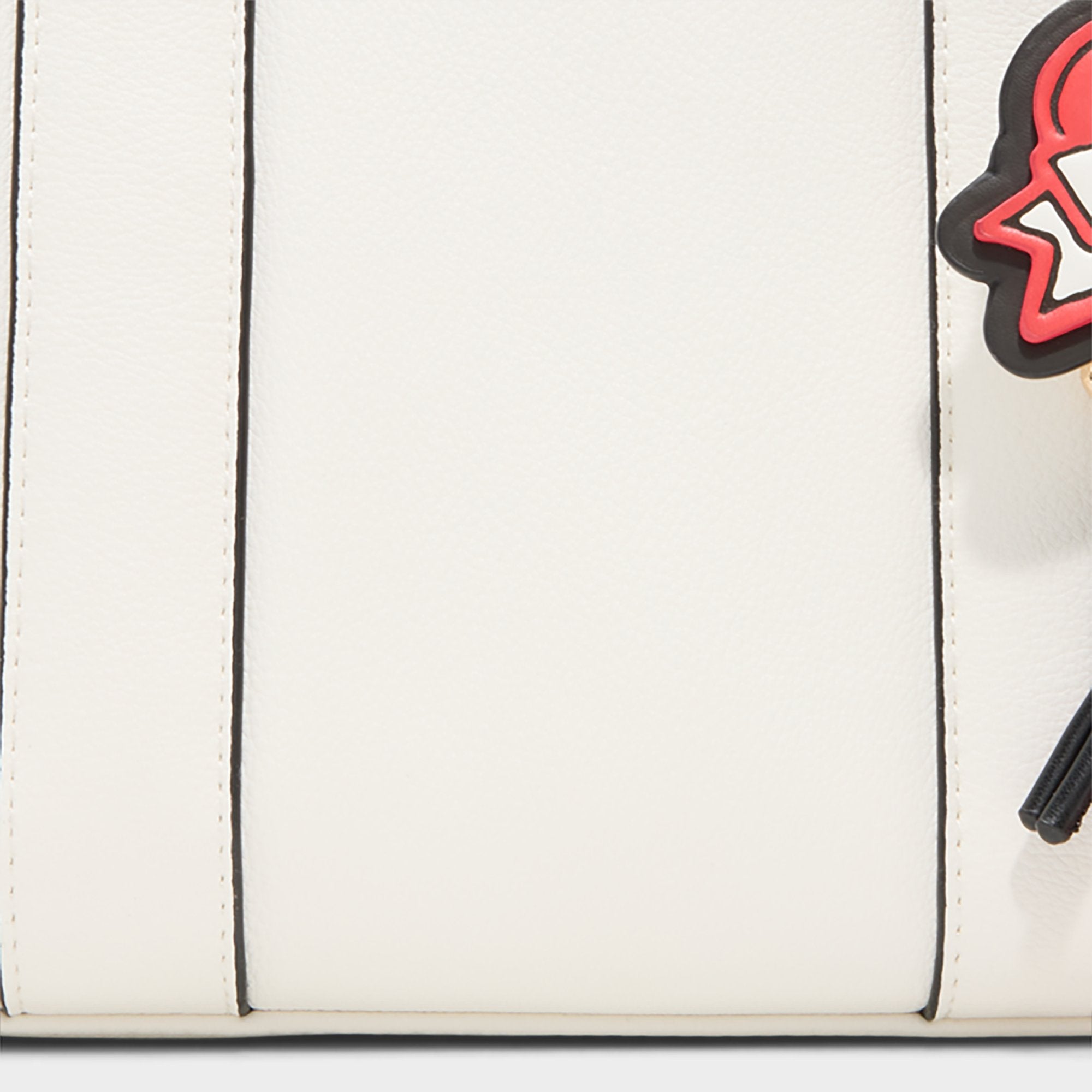 Crisp white panels shape this mini tote into a blank-canvas moment, while a pop-art heart charm swings from the handle as the hero feature that makes errands feel like a street-style moment. Carry it with a blazer for campus runs or tuck it against a sundress at brunch, finishing the look with a playful pop of personality.
